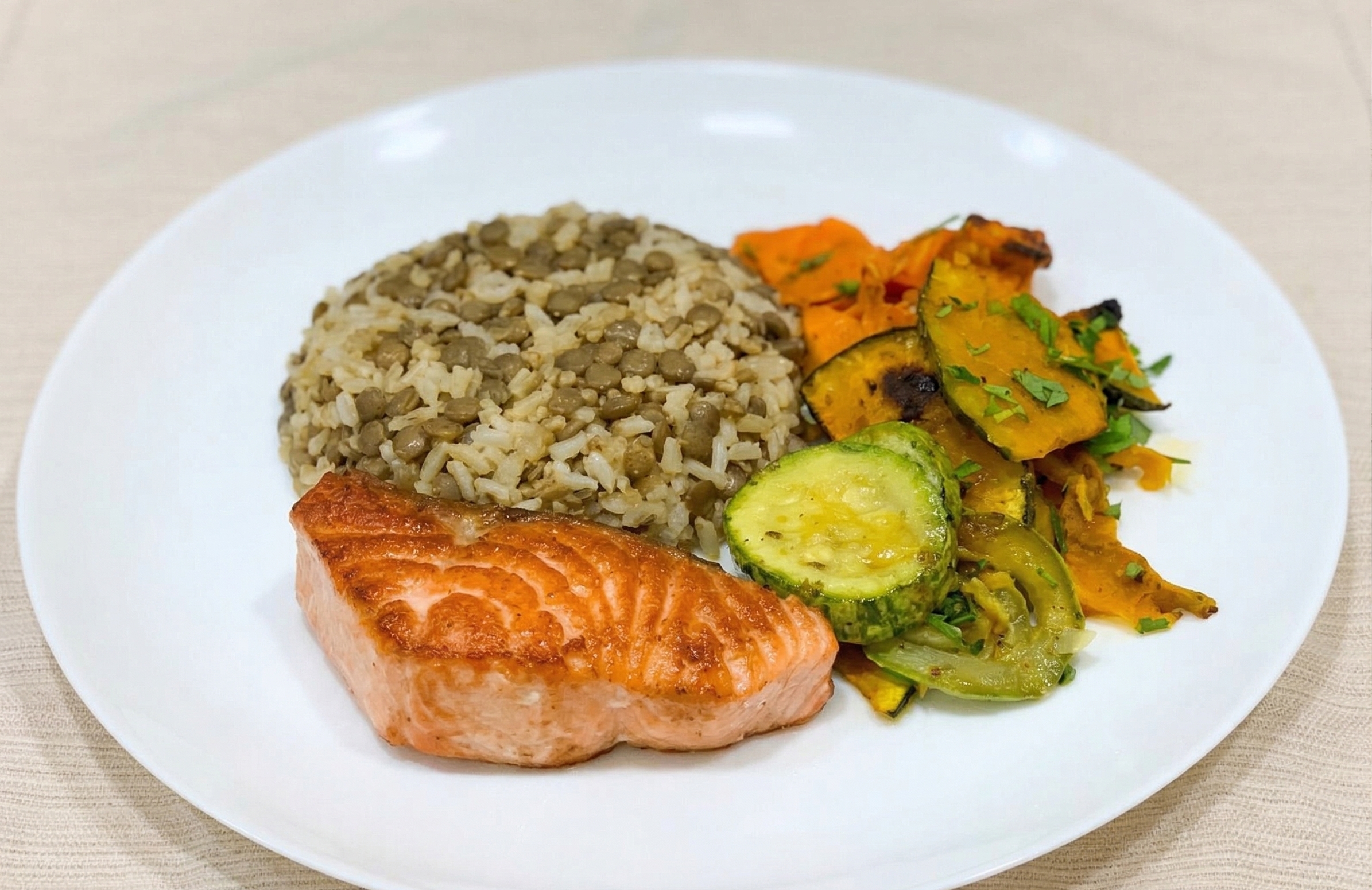Acompanha arroz integral com lentilha, um duo poderoso que une fibras e proteína vegetal em cada garfada, cozido com louro, cebola e alho para um sabor que aquece. E ainda vem com legumes primavera — abóbora, cenoura e abobrinha refogadas levemente, preservando textura, cor e todos os seus nutrientes.